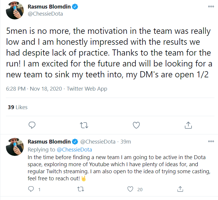 European collective ??5men completely broke up. First, the organizer of Epic League Division 2 reported that, announcing that the team withdrew from the tournament due to its disbandment. After that, the 5men player, ??Rasmus “Chessie” Blomdin, confirmed this information on his Twitter page.