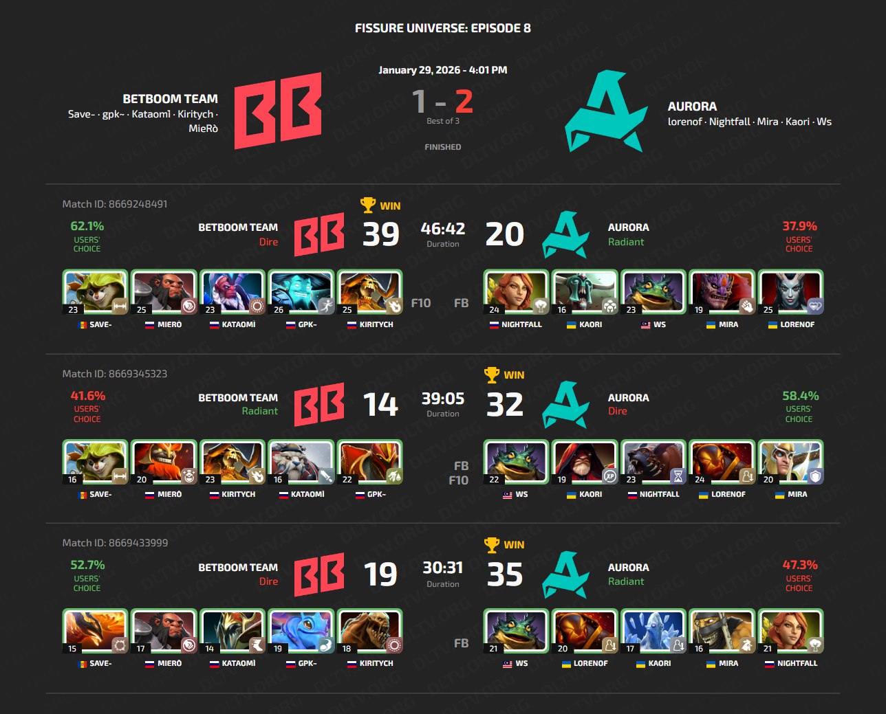 Серия Aurora против BetBoom Team оказалась наиболее непредсказуемой. В последнее время, с тех пор, как решили воплотить идею о создании международного состава, Aurora переживали спад. Первую карту с легкостью забрали BetBoom Team. Однако Ws, пришедший на замену TORONTOTOKYO, показал невероятно эффективного Largo, стабильно держась на второй строчке нетворса. На третьей карте Aurora повторили свой успех. Кстати, это первый турнир BetBoom Team с вернувшимся на пост тренера Boolk. Команда официально заявила, что с приходом rmN- на эту должность увеличилась нагрузка на Save-, просевшего по индивидуалке и ставшего основным драфтером. До этого за коллективом уже закрепилась слава команды, не побеждающей с Boolk а роли коуча. Тем не менее, время покажет, смогут ли BetBoom Team остаться на плаву после решаффла, а пока ребята падают в нижнюю сетку.