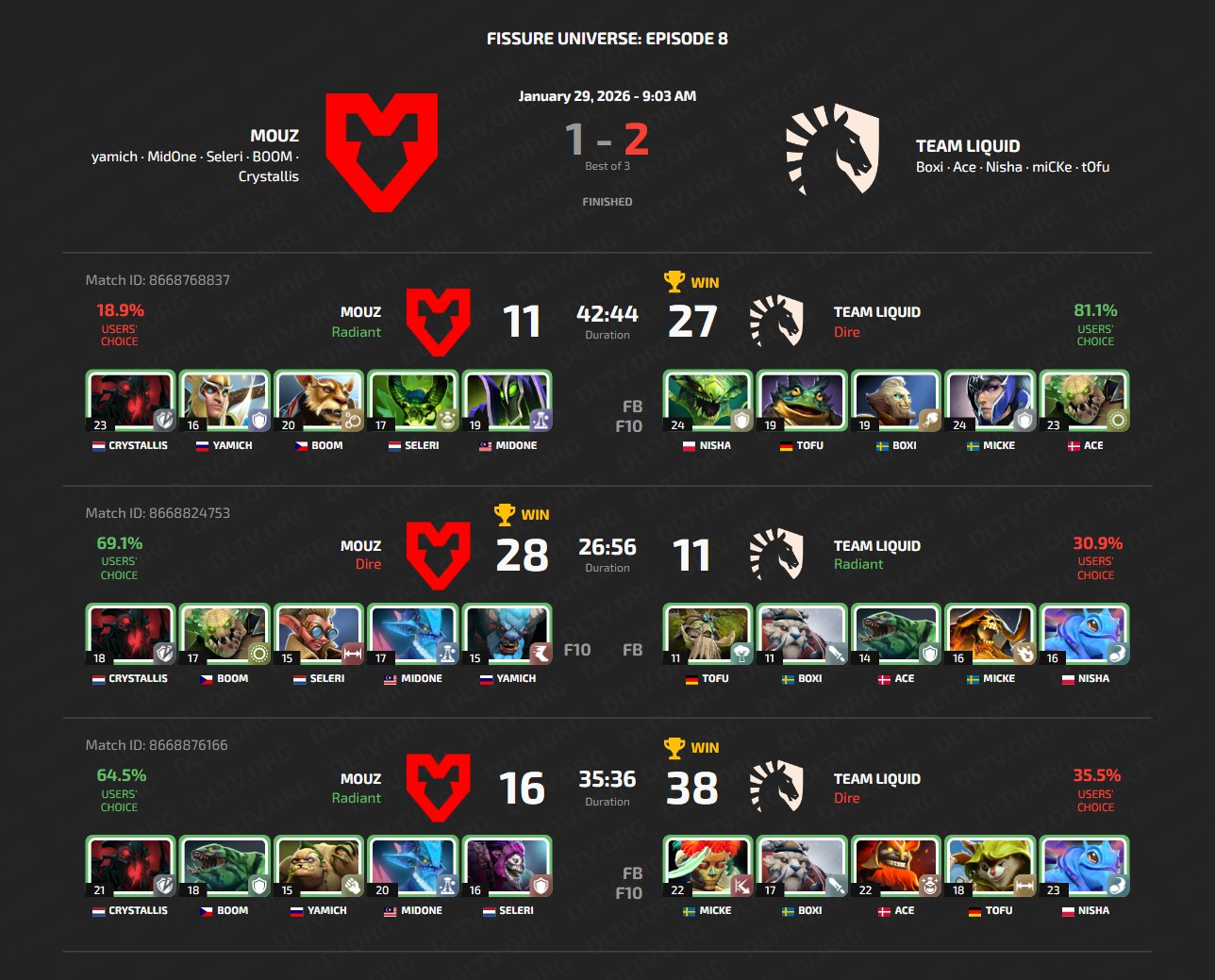 В серии MOUZ и Team Liquid ключевую роль сыграли драфты и реализация файтов: уже на первой карте «Мышки» выбрали героев без синергии и без контроля, из-за чего даже успешные выходы не приносили результата. Показательным стал эпизод с неубиваемым Ace на Underlord под ранним Pipe of Insight. Вся надежда легла на Crystallis на Shadow Fiend, который действительно наносил колоссальный урон в лейте, но без станов не мог реализовать свой потенциал. Несмотря на то, что по микроконтролю и построению драк Team Liquid местами выглядели слабее, грамотные пики дали им решающее преимущество — при нормальном драфте они уверенно закрывали карты. На второй карте отдельно стоит отметить игру Seleri на Snapfire с KDA 9/0/16. Все решилось на тертьей мапе, где не задался фирменный Pudge от yamich, который обычно вносит очень много импакта в игру и грамотно спейсит. Стратегия MOUZ посыпалась и Team Liquid успели набрать критическую массу и снести, не дав сопернику и шанса.
