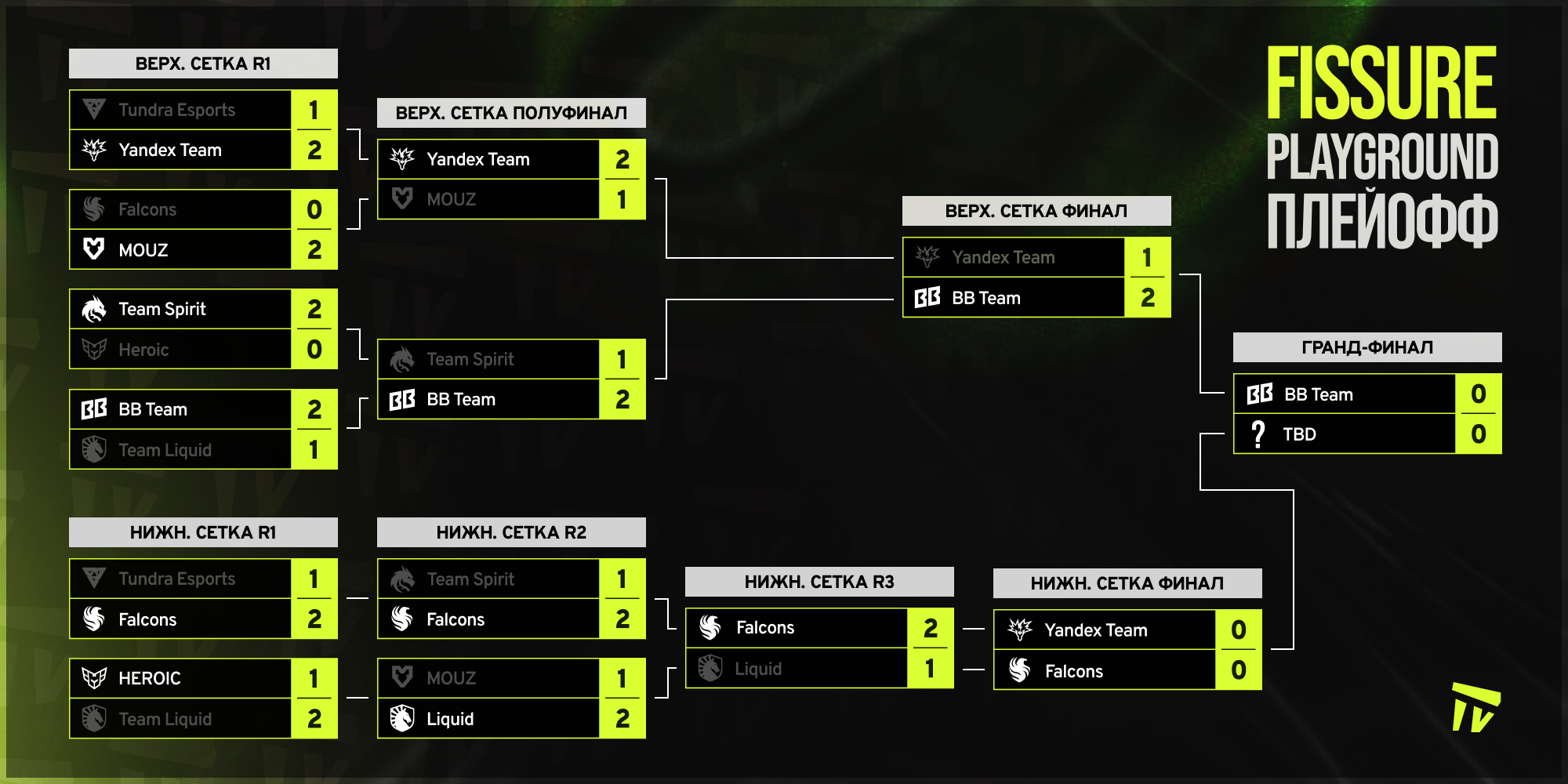 Наступил конец четвертого лдня плей-офф FISSURE Playground 2. Сегодня BetBoom Team уверенно сокрушили Team Yandex и прошлись по верхней сетке турнира в гранд-финал. Тем временем, Team Falcons и Team Yandex завтра поборются за возможность сразится с Kiritych и компанией за первое место.