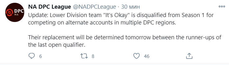 The official reason for disqualification is participation in several DPC regions on fake accounts and under fake names. We remind you that the Its Okay team managed to overcome the second open qualifier and earn a place in the Regional League's lower division.