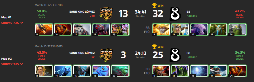 Onto the Lower Brackets, we have Sand King Gomez against fan-favorites B8 Esports. B8 were heavy favorites in this series, and their new players didn’t disappoint.