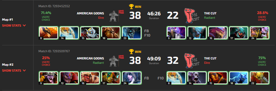 American Goons took on The Cut in a very tight match. The first game was incredibly close, but the American Goons could win in 46 minutes with a Mid Earthshaker from MTD.