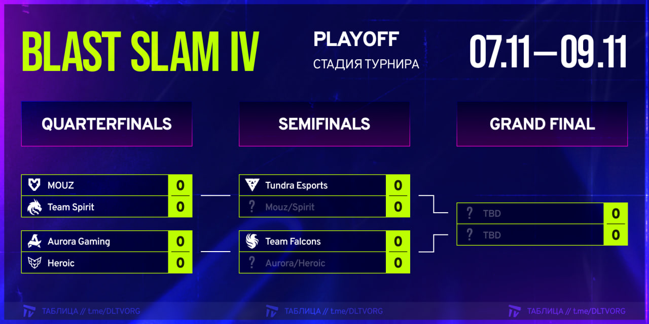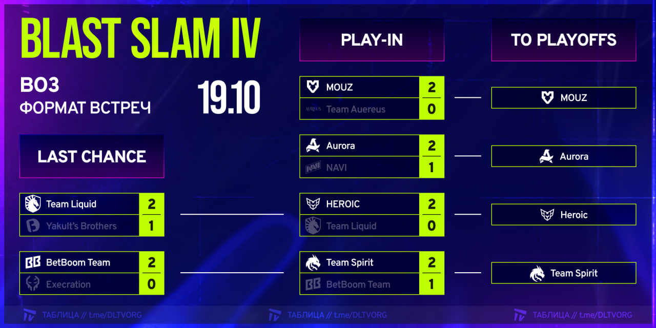 Завершилась Play-In стадия Blast Slam IV по итогам которой в плей-офф прошли Team Spirit, Heroic, MOUZ и Aurora. Эти команды сыграют в четвертьфиналах. Напомним, Team Falcons и Tundra Esports заняли 1-2 места в групповой стадии, что гарантировало им места в полуфиналах турнира.