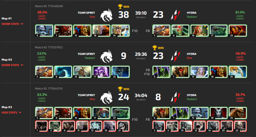 DLTV fans heavily favored Team Spirit’s draft for Game 3, with Hydra going for a 24th-pick Lifestealer. Team Spirit slightly won the laning stage and proceeded to make good rotations as a unit to choke Hydra out of their map. Game 3 turned out to be a straightforward game for the better team, as Team Spirit finished the game 34 minutes in, with Hydra's Carry last pick feeling very underwhelming. After losing this game, Hydra now risks relegation to Division II.