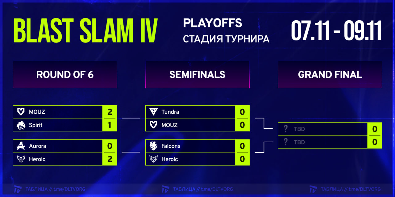 Плей-офф Blast Slam IV проходит с 7 по 9 ноября в Сингапуре. Призовой фонд турнира составляет 1 миллион долларов.