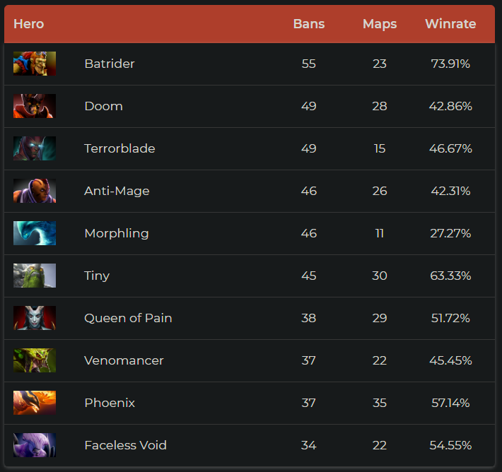 Batrider был самым опасным героем турнира: его банили 51 раз. При этом в матчах, где он был выбран, его винрейт составлял больше 72%.