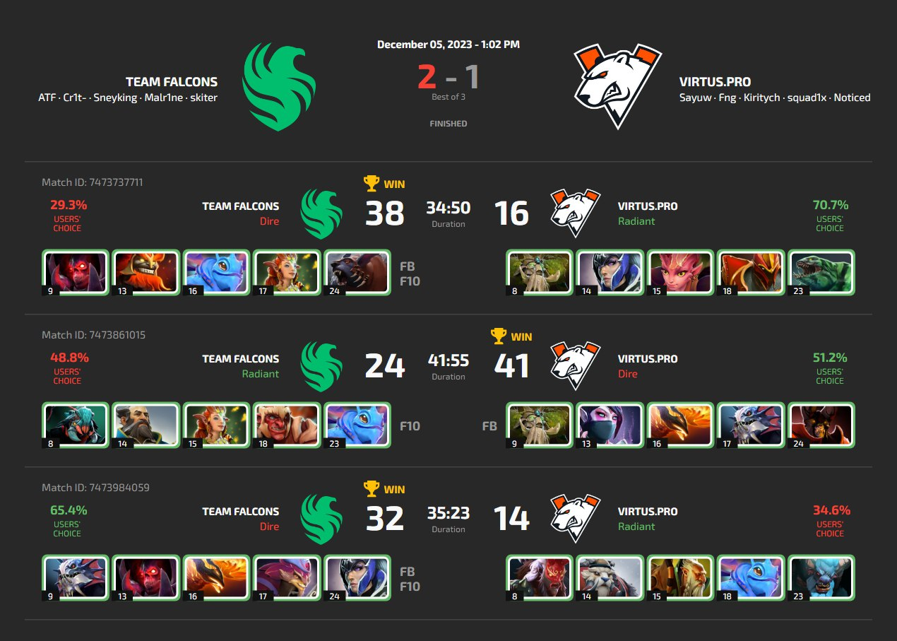 In the Lower Bracket, Falcons took care of Virtus.Pro, one of the strongest competitors in the tournament with a score of 2-1. The MENA squad easily won the first game, and the second game looked excellent in the laning stage. However, Virtus.Pro could steal the second map from the Falcons, but it didn’t matter, as Falcons could quickly close the series by winning Game 3.