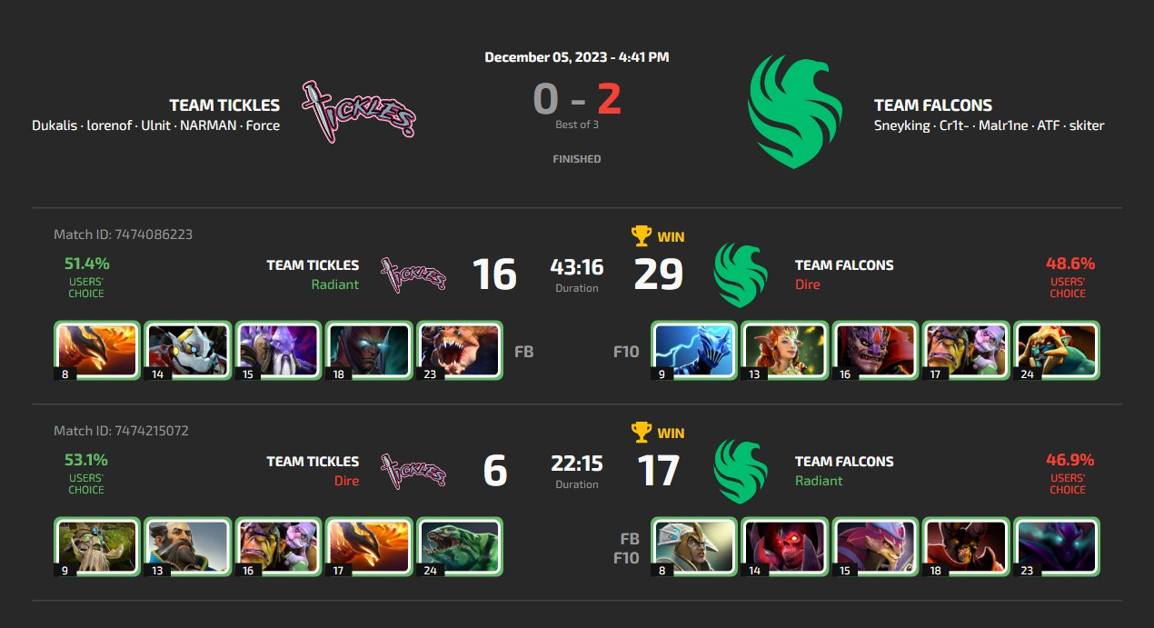 The victory against Virtus.Pro put Falcons in the Lower Bracket Final, where they faced Team Tickles. In the first game, Falcons demolished the ex-Geek Fam stack to be up 1-0. Unfortunately, in the second game, Team Tickles Offlaner Force had issues with his game. He tried restarting Dota three times, but simply could not reconnect to the game. After a long pause, the game was forced to resume with Team Tickles playing 4 vs 5. Due to this, Team Tickles called GG at the 22-minute mark, giving Falcons the series win.