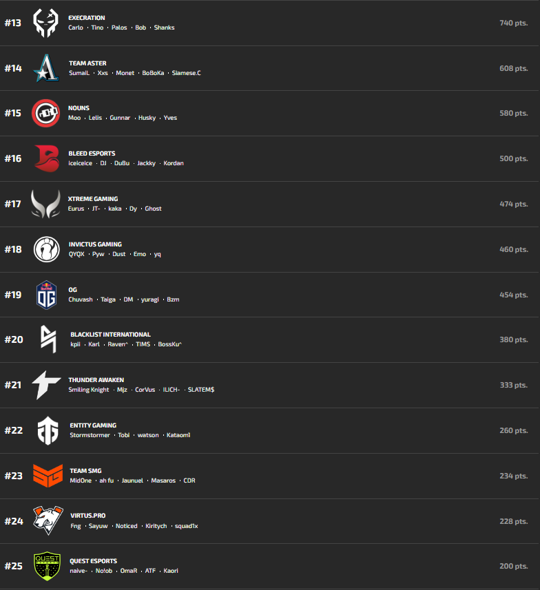 Quest, Blacklist International, and Invictus Gaming are sitting very low on the rankings. Still, if any of these teams win the Bali Major, they will be awarded 600 DPC points and likely qualify for The International.