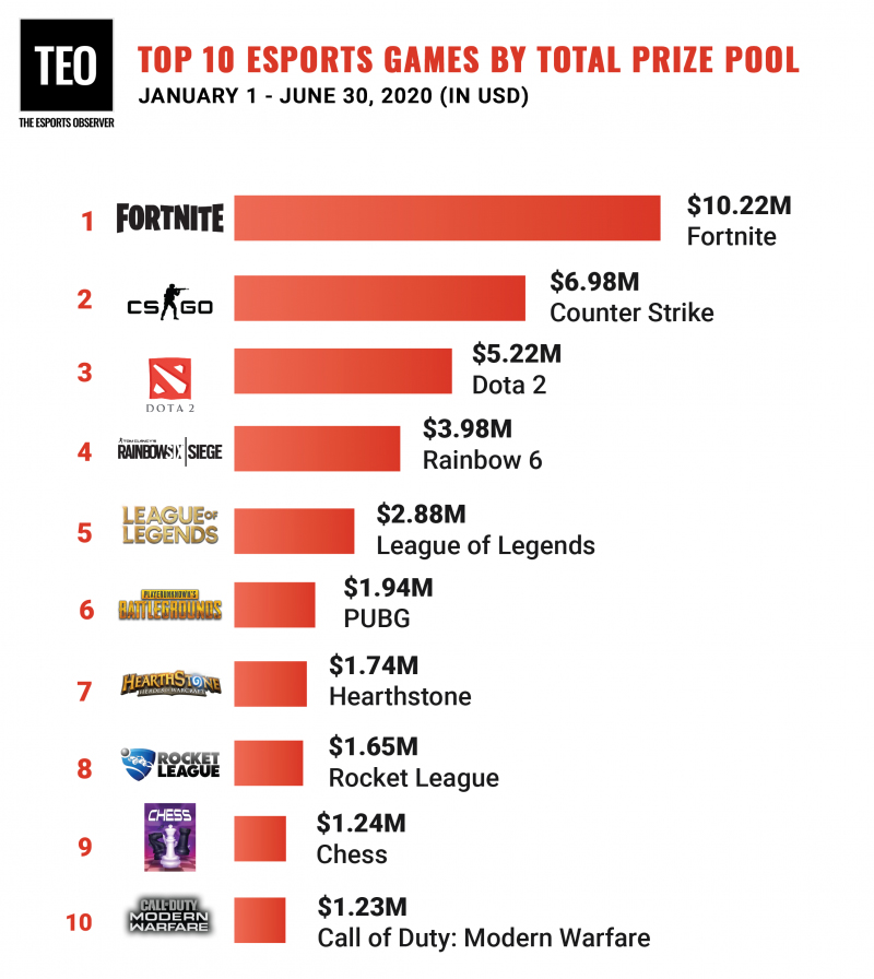 Даже несмотря на то, что за последние три месяца в Dota 2 проходит огромное количество онлайн чемпионатов для четырех регионов (Европа/СНГ, Китай, Америка, Азия), ей не хватило этого даже для топ-2 рейтинга. На нем расположилась вторая киберспортивная дисциплина от Valve – CS:GO. Безоговорочным лидером с внушительным отрывом стал Fortnite.