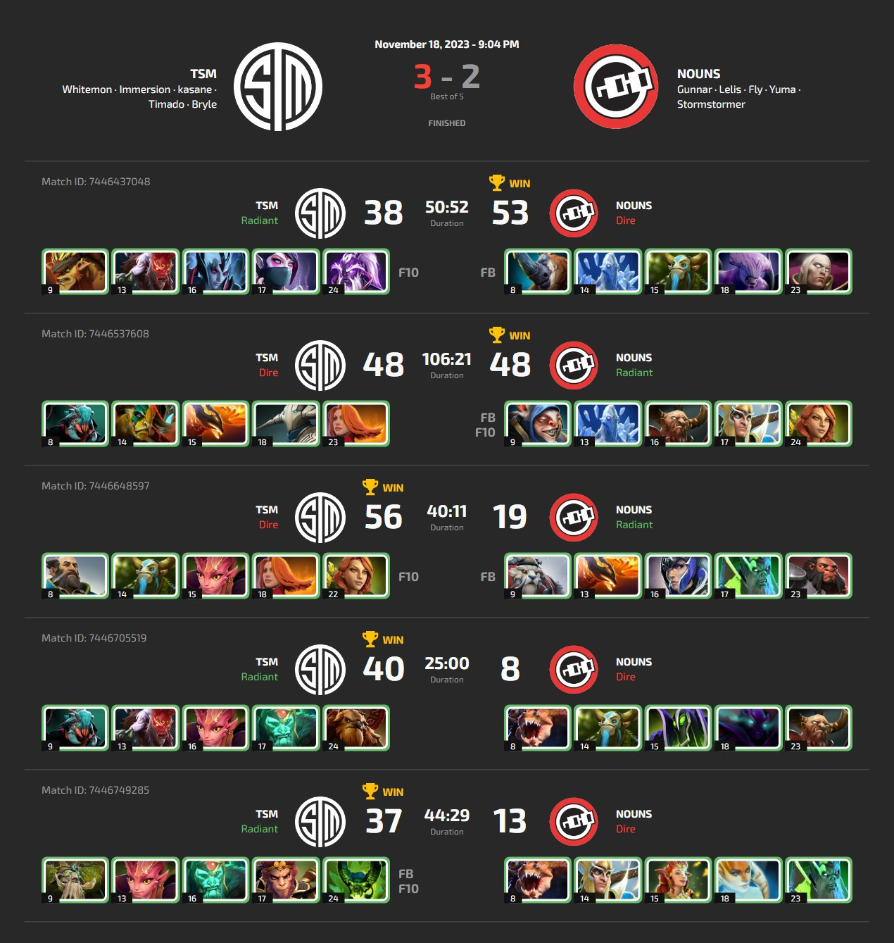 TSM defeated Nouns in the Grand Final with a tight score of 3-2. Nouns had a 2-0 lead in the series, but TSM could keep their composure and complete the reverse sweep.