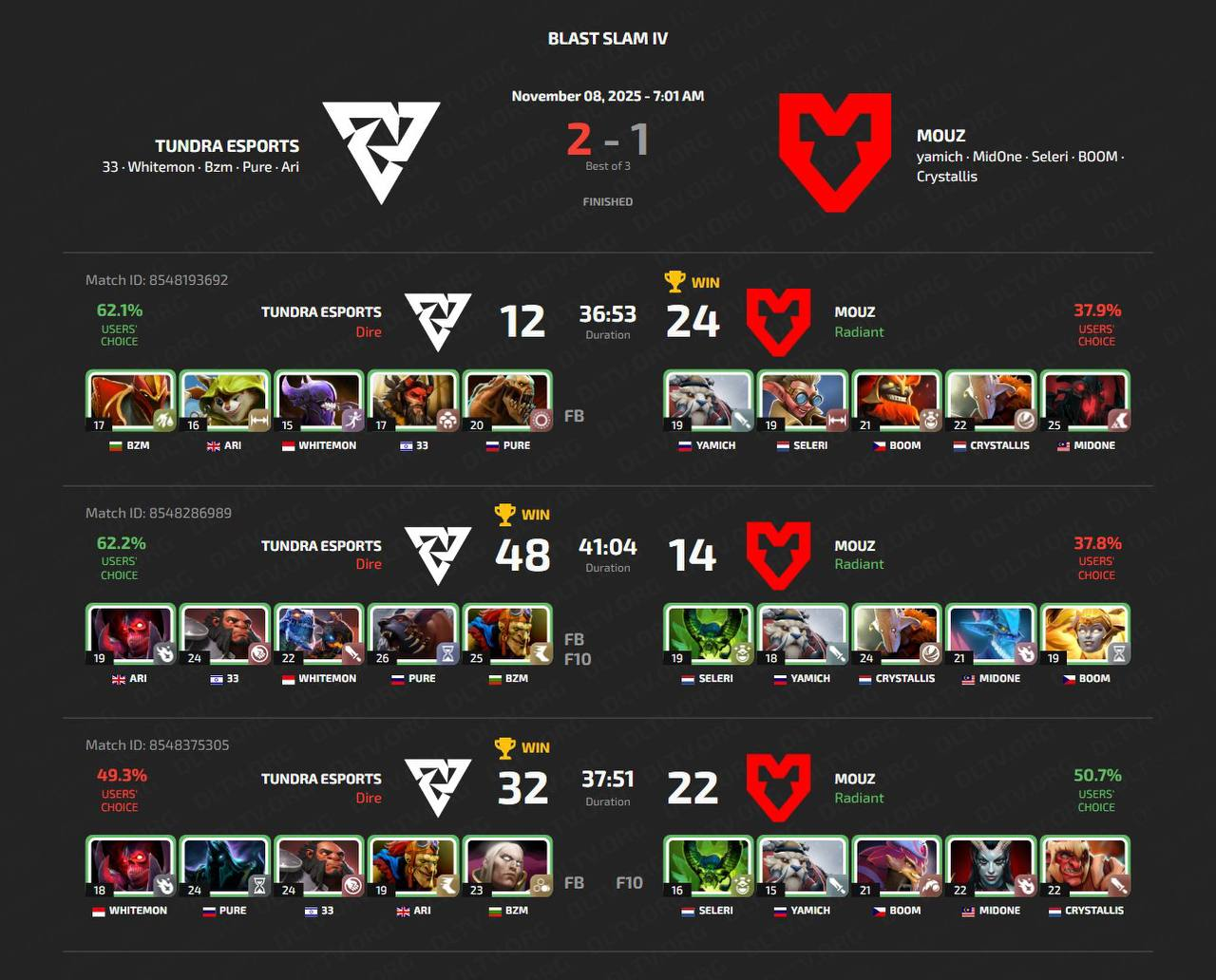 В первом матче дня Tundra Esports оказались сильнее MOUZ по результатам трех карт. Не смотря на поражение, лучшим игроком серии стал MidOne, сыгравший 10/0/11 на Shadow Fiend в победной карте и 10/2/9 на QoP в решающей, которую начал с ультракила до выхода крипов. На данный момент MOUZ не хвататет опыта на Тир-1 сцене.