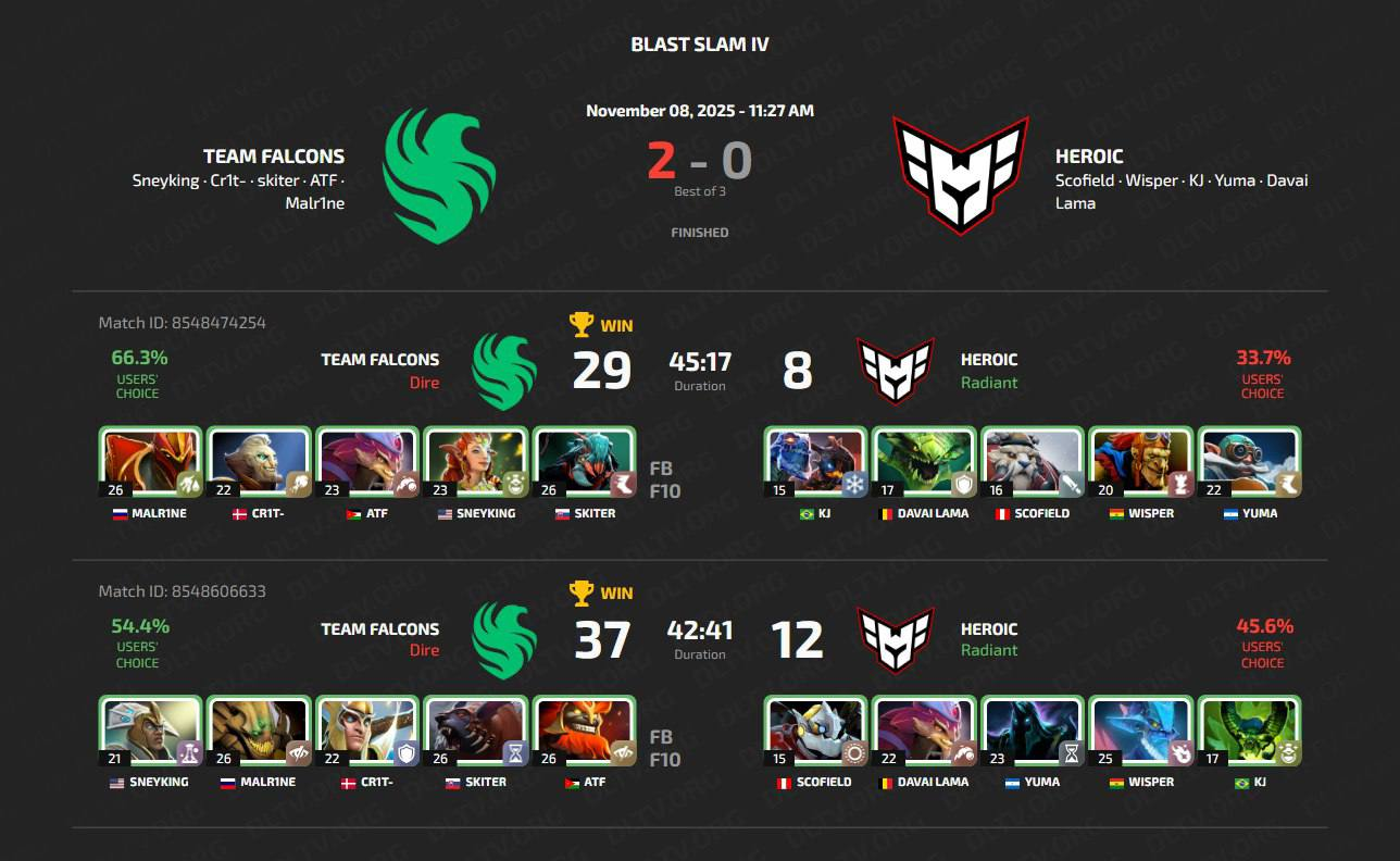 Во втором матче Team Falcons без шансов переехали Heroic со счетом 2-0, за две карты Heroic сделали лишь 20 фрагов.