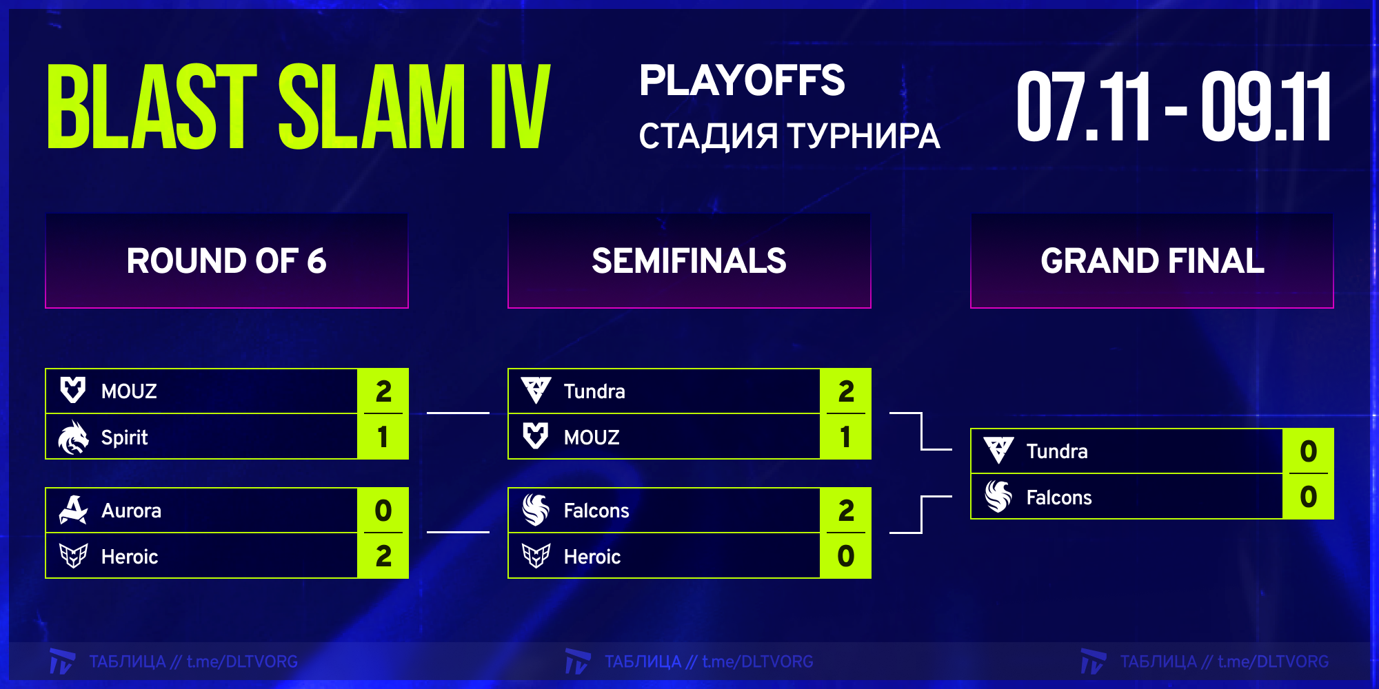 Плей-офф Blast Slam IV проходит с 7 по 9 ноября в Сингапуре. Призовой фонд турнира составляет 1 миллион долларов.